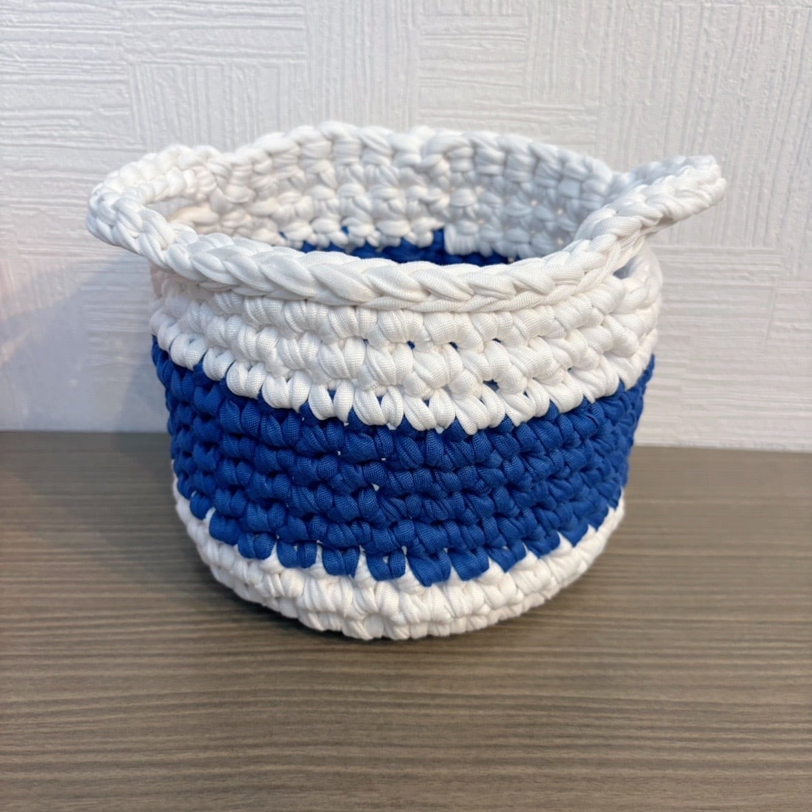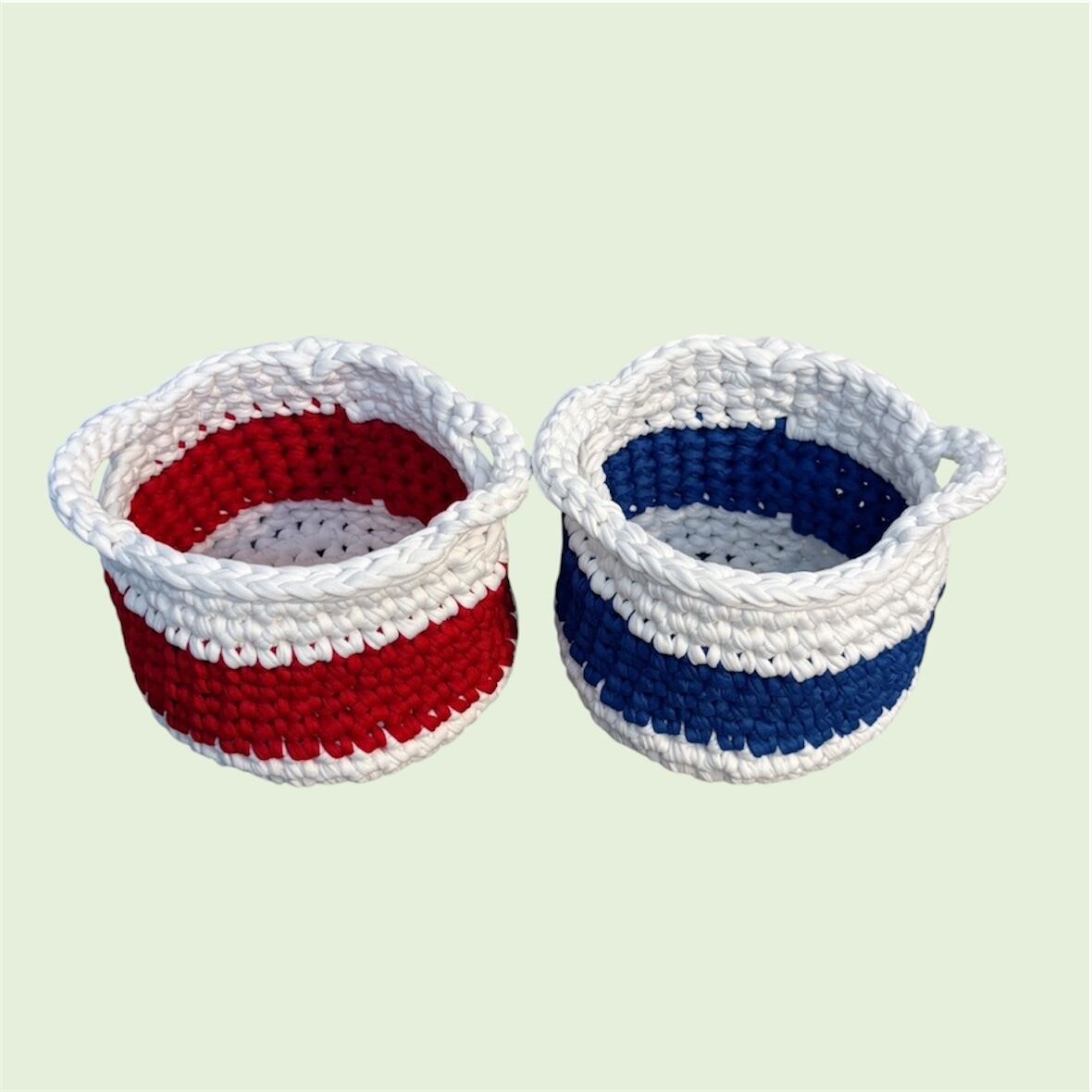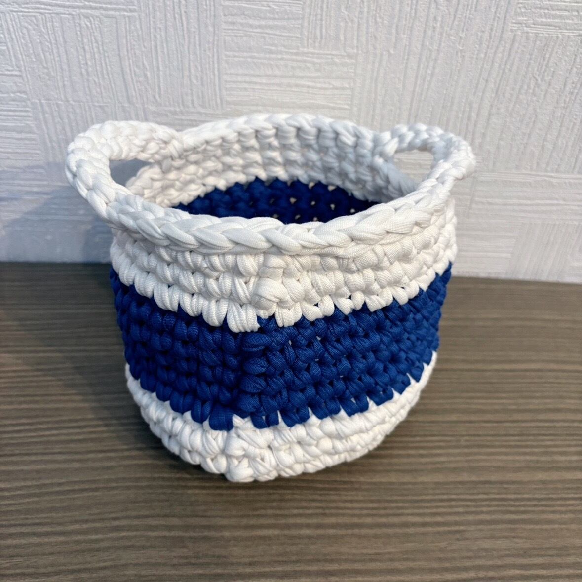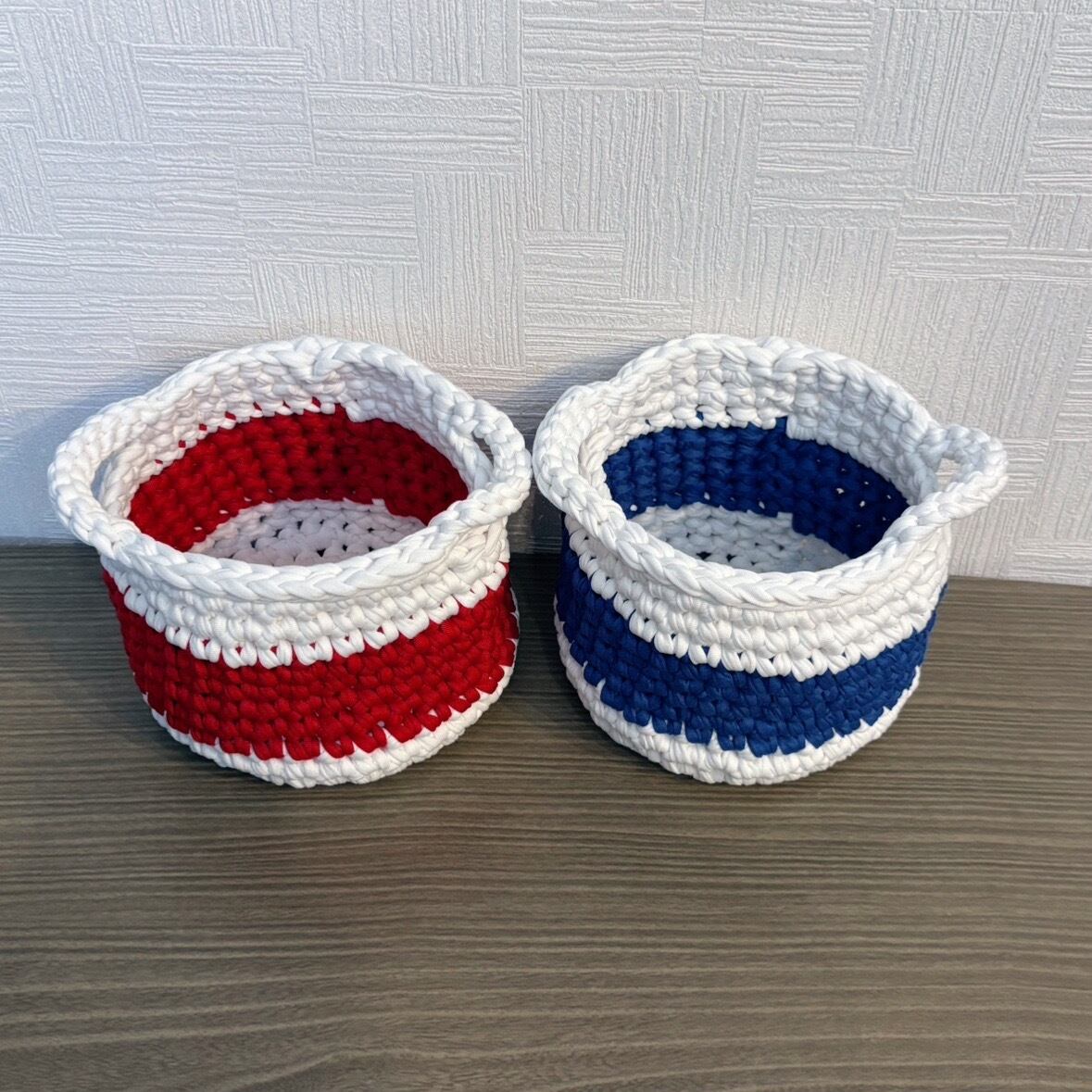 フレンチカラーのラインが目を引く、ポップでかわいい手編み雑貨です♪